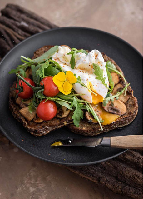 - Dans votre assiette, étalez un peu de pesto sur le pain perdu. Ajoutez les champignons, la roquette, l’œufs pochés, les tomates cerises et dégustez.