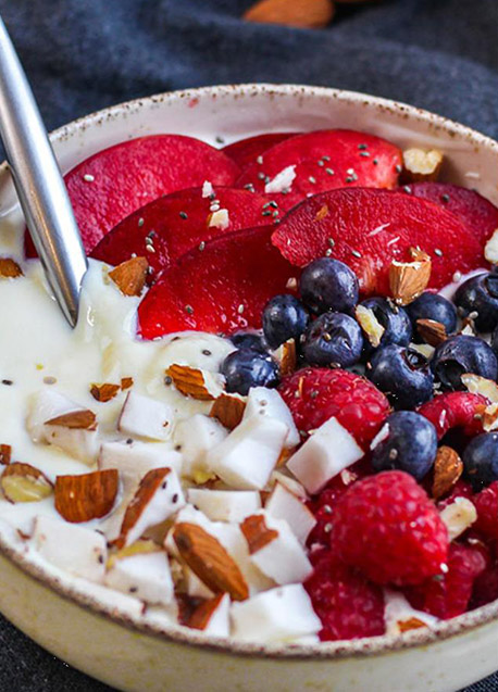 - Lave et découpez vos fruits, puis disposez les harmonieusement sur le yaourt.